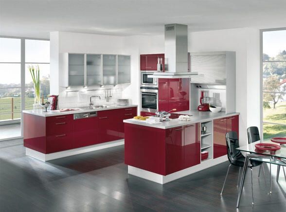 In Purpur (Hochglanz) gehalten und mit weißen Oberschränken ausgestattet, wird hier eine klassische Schönheit erschaffen. Die weiße Arbeitsplatte und die weißen Sockel haben eine unwiderstehliche Ausstrahlung und werden durch Backrohr und Mikrowelle auf Augenhöhe sinnvoll ergänzt.